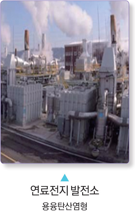 용융탄산염형(MCFC : Molten Carbonate Fuel Cell) 전해질로 용융탄산염(Li₂CO₃, K₂CO₃)을 사용하며, 운전온도는 600~700 ℃ 인 고온형 연료 전지입니다. 전극 촉매가 필요 없으며 발전효율이 높습니다.